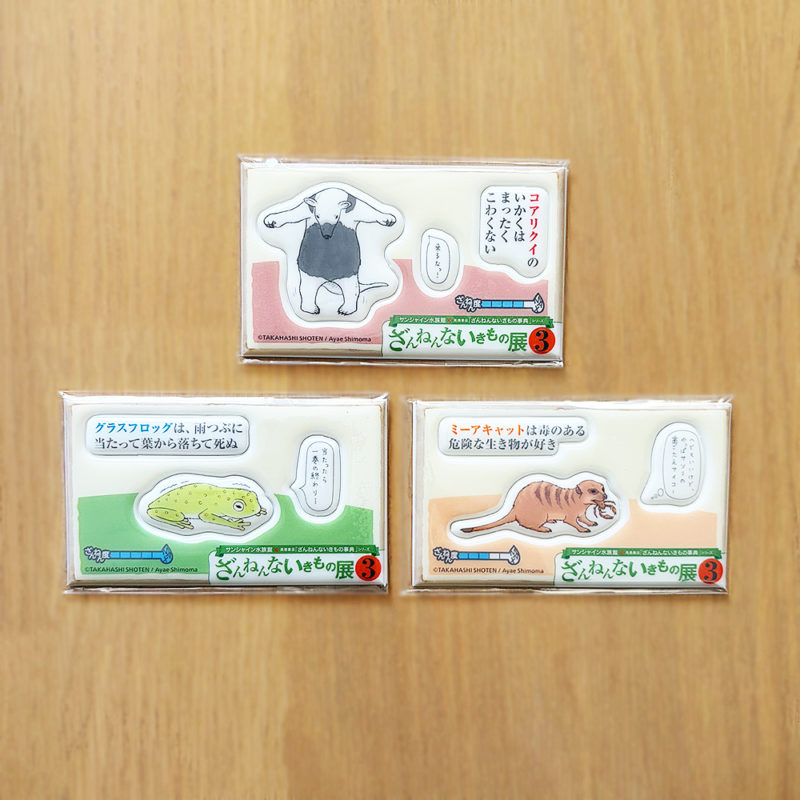 書籍のイラストを使った「ざんねんないきもの展3」オリジナルぷっくりシール(全3種)がセットになった入場チケットも販売されています!!
